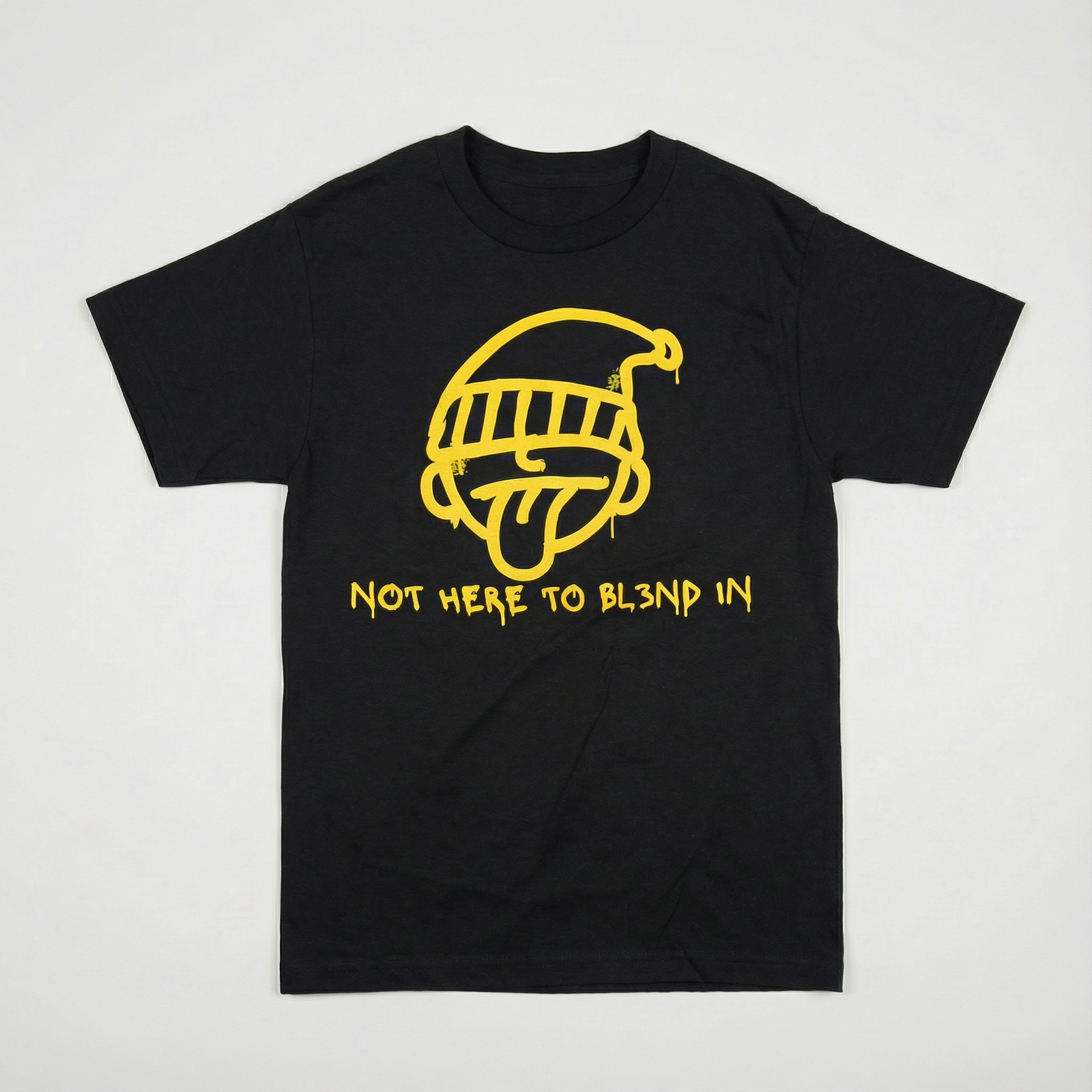The bold yellow graphic represents individuality in motion—unfiltered, unapologetic, and impossible to ignore. Finished with the words “NOT HERE TO BL3ND IN”, this piece is for those who move diffrnt and never dilute who they are to be accepted.